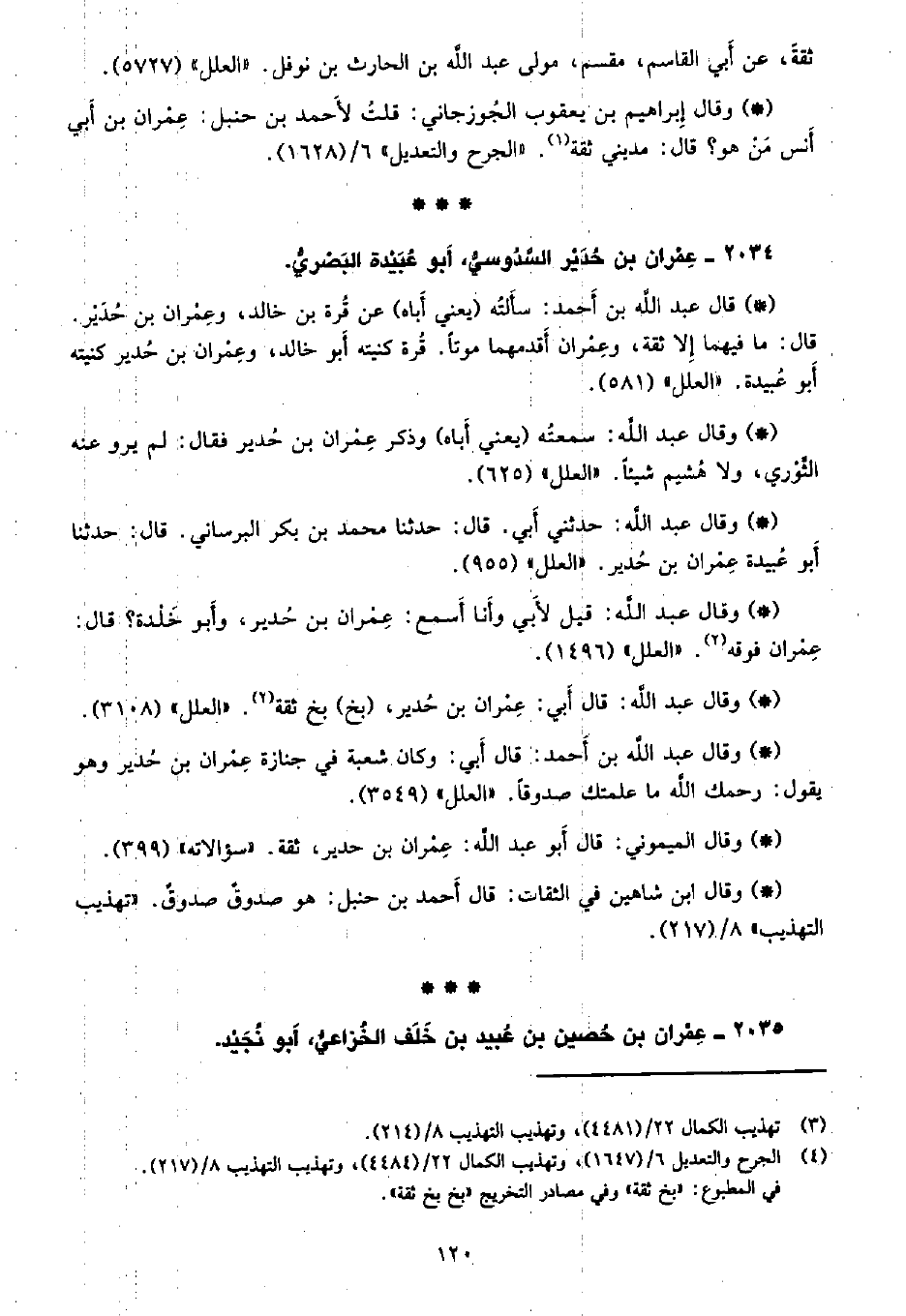 • وقال عبد الله: قيل لأبي وأنا أسمع: عمران بن حدير، وأبو خلدة؟ قال: عمران فوقه. «العلل» (1496) .