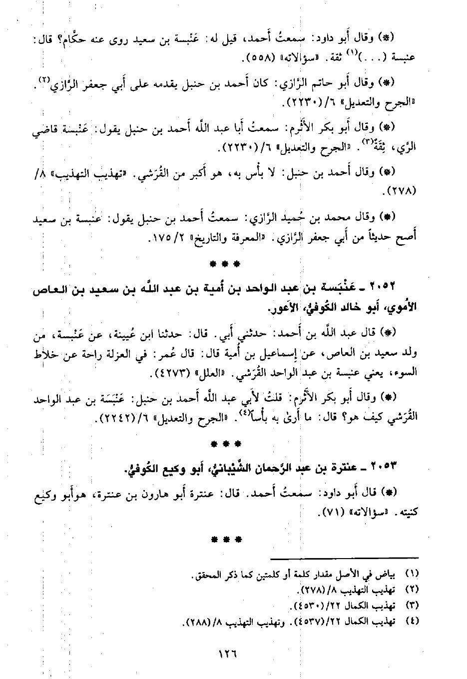 • وقال أبو بكر الأثرم: قلت لأبى عبد الله أحمد بن حنبل: عنبسة بن عبد الواحد القرشي كيف هو؟ قال: ما أرى به بأسًا. «الجرح والتعديل» 6/ (2242) .