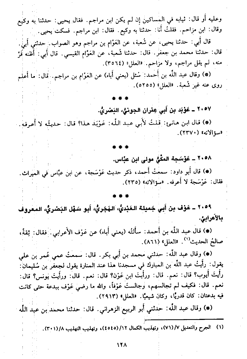 • قال عبد الله بن أحمد: سألته (يعنى أَباه) عن عوف الأعرابي، فقال: ثقة، صالح الحديث. «العلل» (861) .