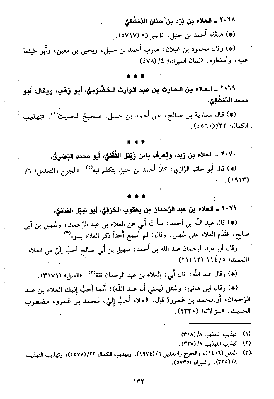 • قال عبد الله بن أحمد: سألت أبي عن العلاء بن عبد الرحمن، وسهيل بن أبى صالح، فقدم العلاء على سهيل، وقال: لم أسمع أحدًا ذكر العلاء بسوء.