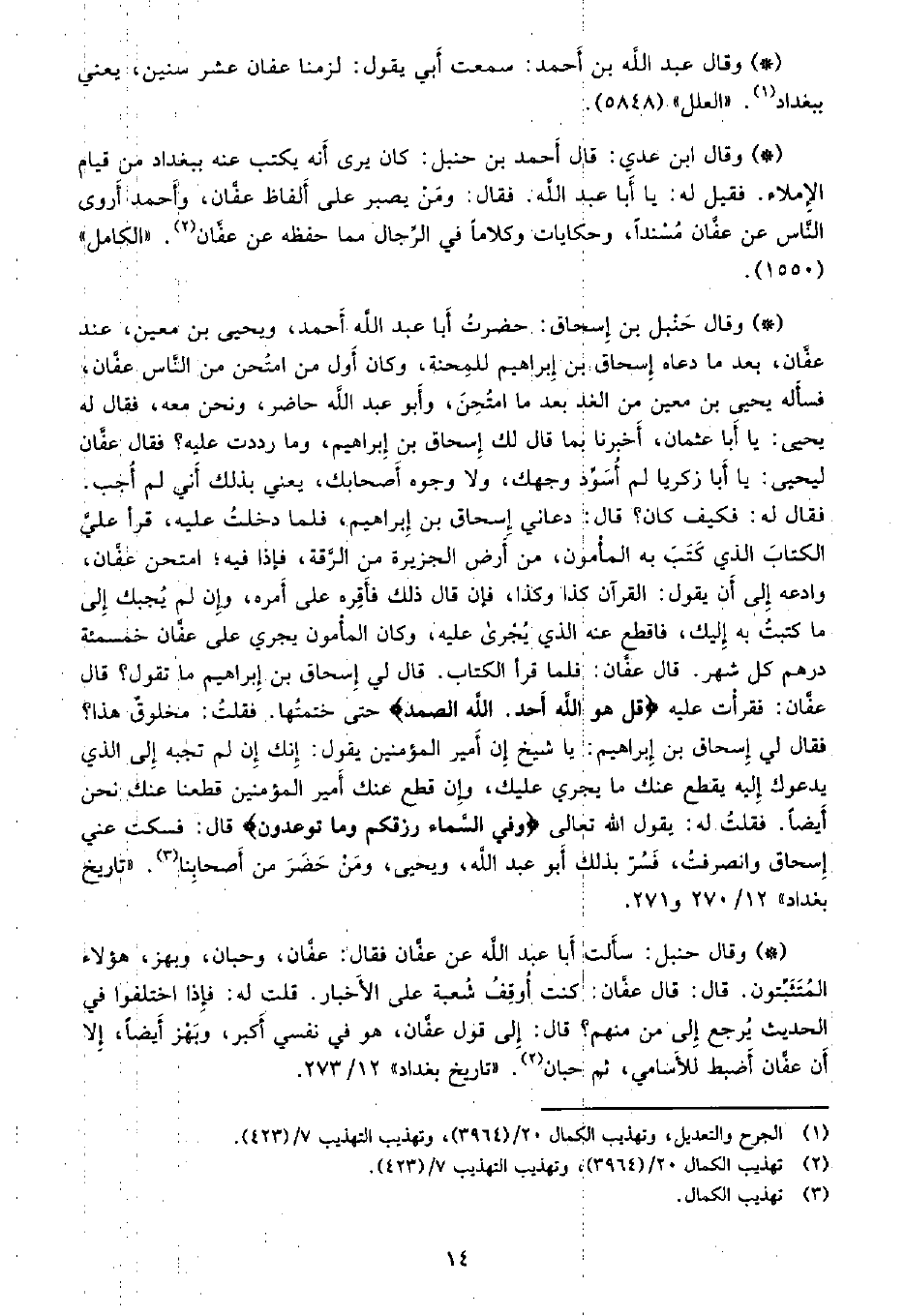 • وقال حنبل بن إسحاق: حضرت أبا عبد الله أحمد، ويحيى بن معين، عند عفان، بعد ما دعاه إسحاق بن إبراهيم للمحنة، وكان أول من امتحن من الناس عفان، فسأله يحيى بن معين من الغد بعد ما امتحن، وأبو عبد الله حاضر، ونحن معه، فقال له يحيى: يا أبا عثمان، أخبرنا بما قال لك إسحاق بن إبراهيم، وما رددت عليه؟ فقال عفان ليحيى: يا أبا زكريا لم أسود وجهك، ولا وجوه أصحابك، يعني بذلك أني لم أجب، فقال له: فكيف كان؟ قال: دعاني إسحاق بن إبراهيم، فلما دخلت عليه، قرأ علي الكتاب الذي كتب به المأمون، من أرض الجزيرة من الرقه، فإذا فيه؟ امتحن عفان، وادعه إلى أن يقول القرآن كذا وكذا، فإن قال ذلك فأقره على أمره، وإن لم يجبك إلى ما كتبت به إليك، فاقطع عنه الذى يجرى عليه، وكان المأمون يجري على عفان خمسمئة درهم كل شهر، قال عفان: فلما قرأ الكتاب، قال لي إسحاق بن إبراهيم ما تقول؟ قال عفان؟ فقرأت عليه " قُلْ هُوَ اللَّهُ أَحَدٌ، اللَّهُ الصَّمَدُ " حتى ختمتها، فقلت: مخلوق هذا؟ فقال لي إسحاق بن إبراهيم: يا شيخ إن أمير المؤمنين يقول: إنك إن لم تجبه إلى الذي يدعوك إليه يقطع عنك ما يجرى عليك، وان قطع عنك أمير المؤمنين قطعنا عنك نحن أيضا، فقلت له: يقول الله تعالى " وَفِي السَّمَاءِ رِزْقُكُمْ وَمَا تُوعَدُونَ " قال: فسكت عني إسحاق وانصرفت، فسر بذلك ابو عبد الله، ويحيى، ومن: حضر من أصحابنا. «تاريخ بغداد» 12/270 و271.