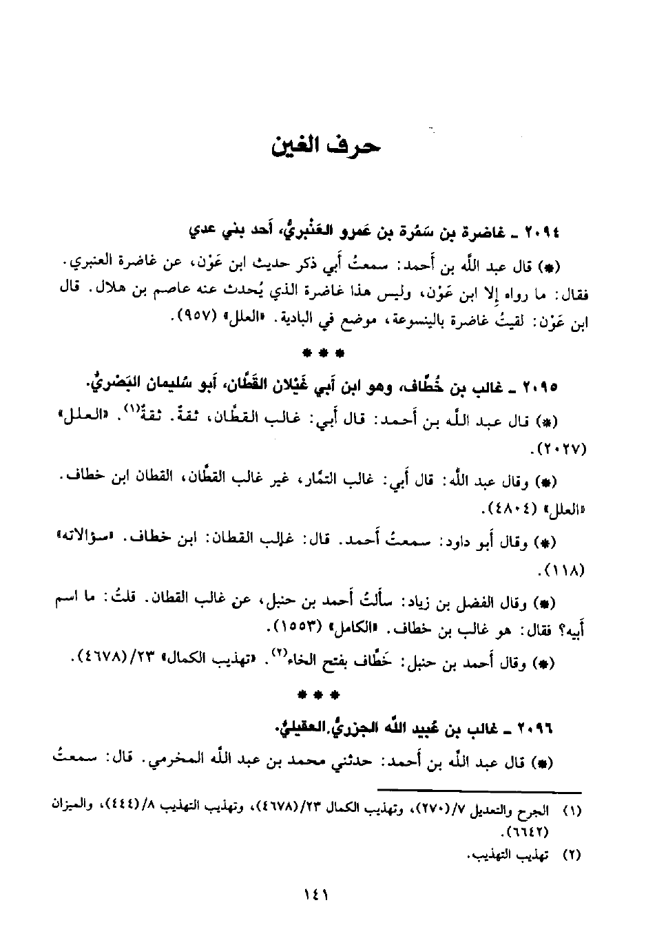 • وقال الفضل بن زياد: سألت أحمد بن حنبل، عن غالب القطان، قلت: ما سم أبيه؟ فقال: هو غالب بن خطاف. «الكامل» (1553) .