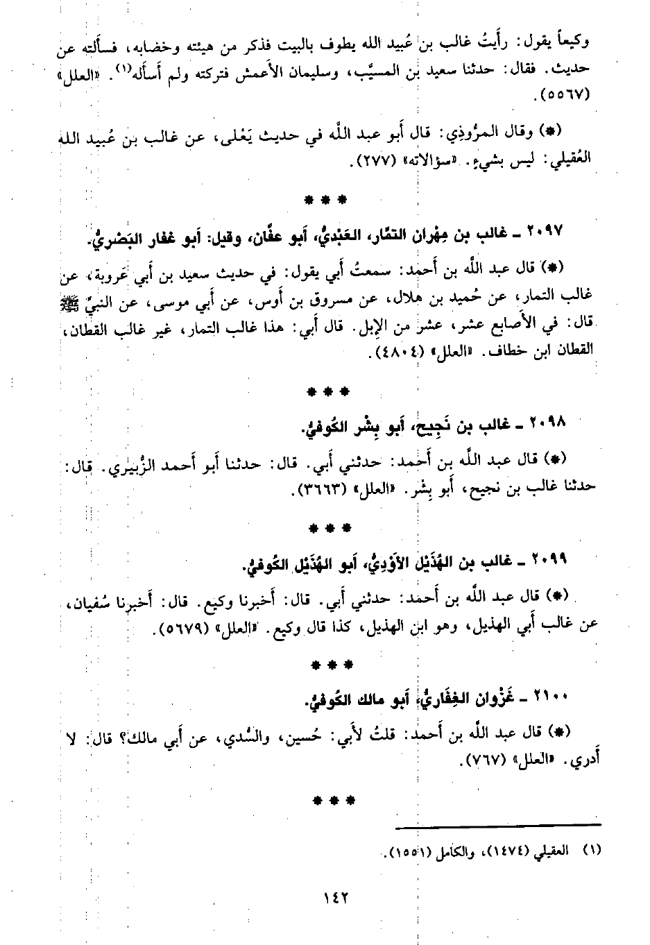 • قال عبد الله بن أحمد: سمعتُ أَبي يقول: في حديث سعيد بن أبي عروبة، عن غالب التمار، عن حميد بن هلال، عن مسروق بن أوس، عن أبي موسى، عن النبي - صلى الله عليه وسلم - قال: في الأصابع عشر، عشر من الإبل، قال أبي: هذا غالب التمار، غير غالب القطان، القطان ابن خطاف. «العلل» (4804) .