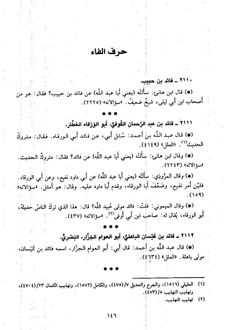 • وقال ابن هانىء: سألته (يعني أبا عبد الله) عن فائد؟ فقال: متروك الحديث. «سؤالاته» (2243) .