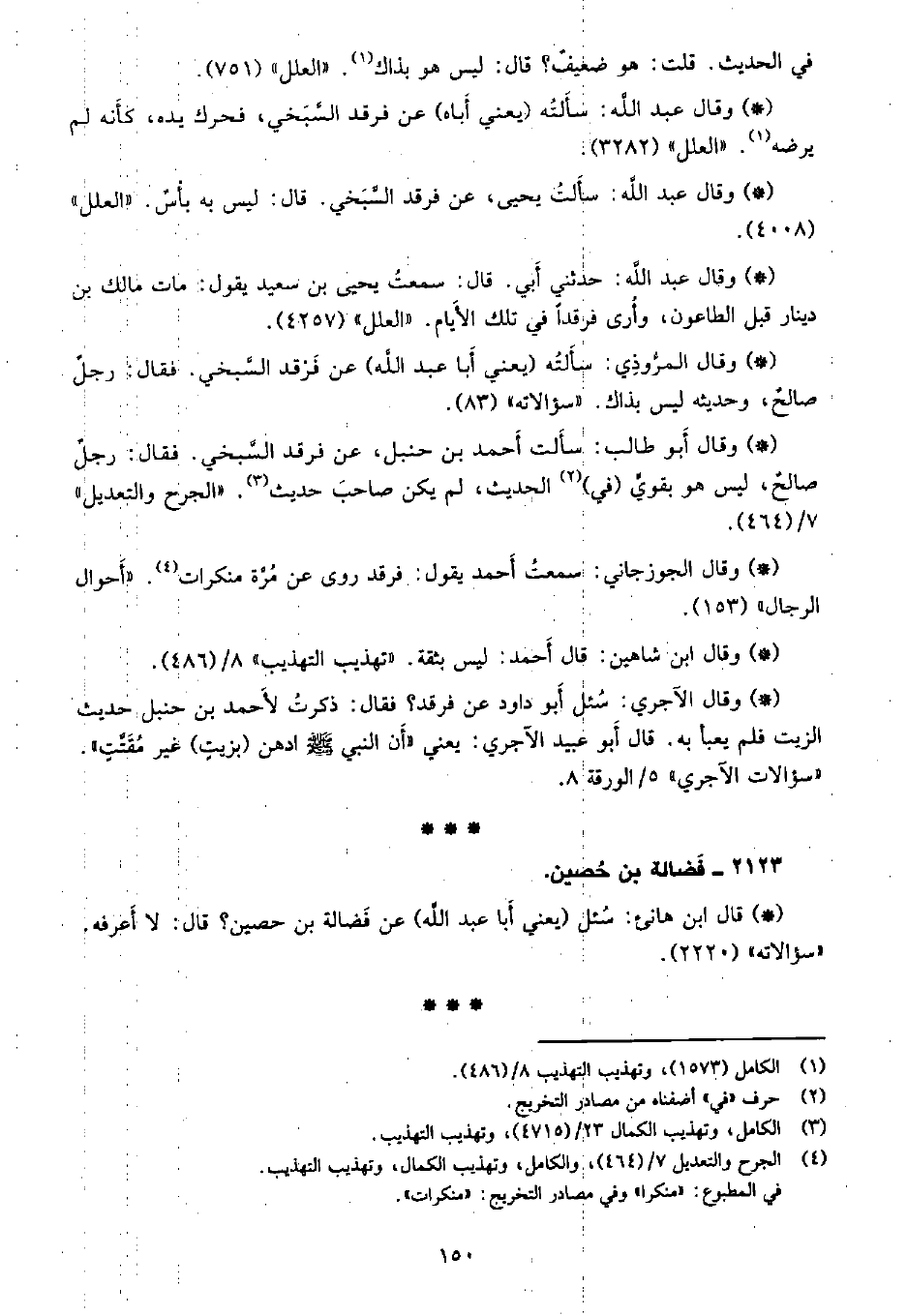 • وقال عبد الله: سألته (يعني أباه) عن فرقد السبخي، فحرك يده، كأنه لم يرضه. «العلل» (3282) .
