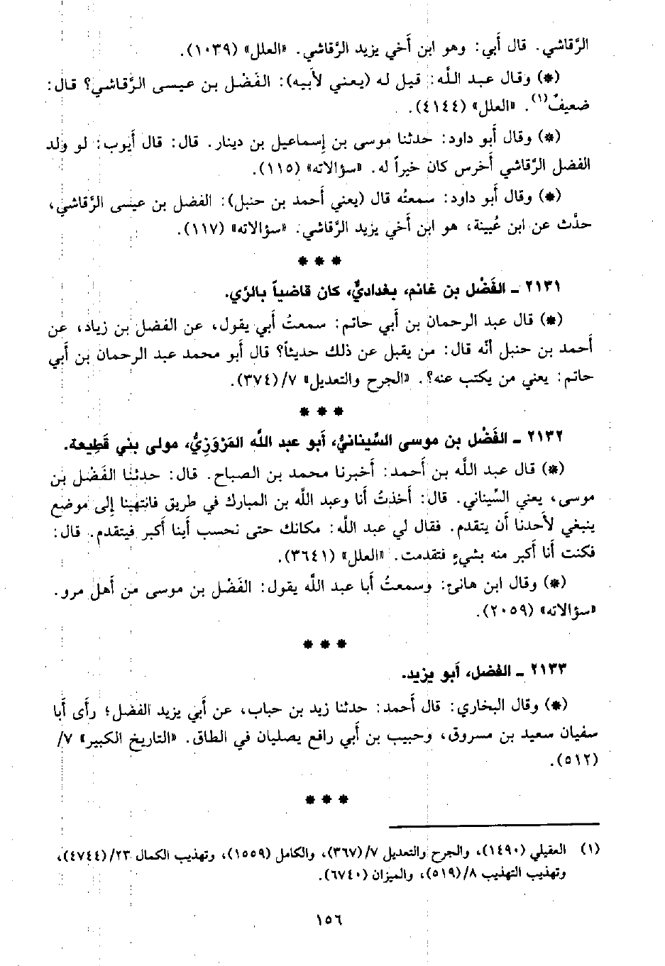 • وقال عبد الله: قيل له (يعني لأبيه) : الفضل بن عيسى الرقاشي؟ قال: ضعيف. «العلل» (4144) .