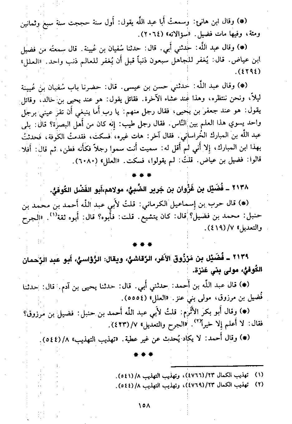 • وقال عبد الله: حدثني أبي. قال: حدثنا سفيان بن عيينة، قال سَمِعتُهُ من فضيل بن عياض، قال: يغغر للجاهل سبعون ذنبًا قبل أن يغفر للعالم ذنب واحد. «العلل» (4294) .