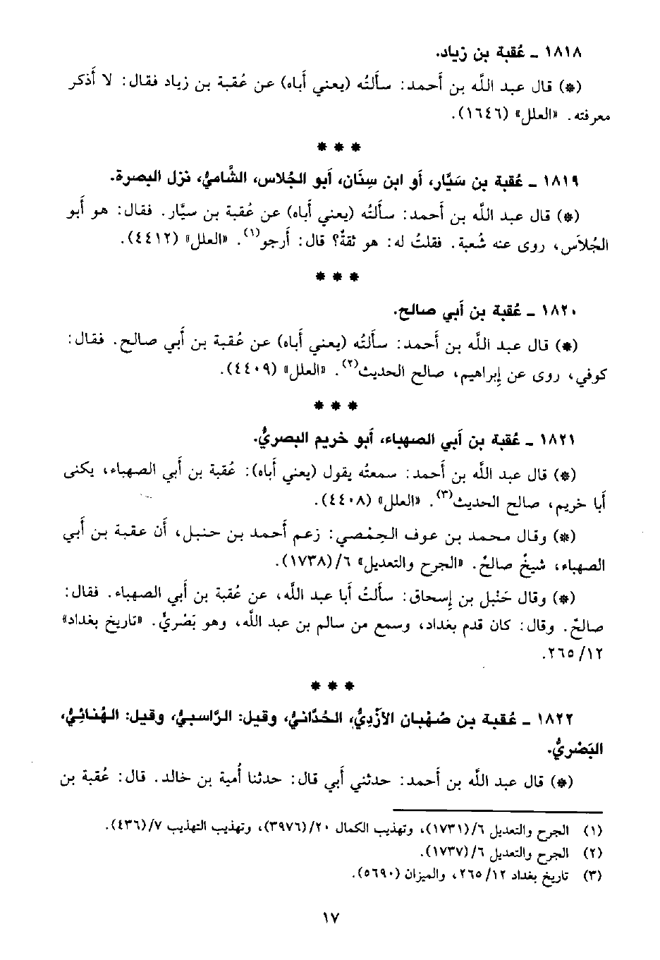 • وقال حنبل بن إسحاق: سألت أبا عبد الله، عن عُقْبة بن أبي الصهباء، فقال: صالح، وقال: كان قدم بغداد، وسمع من سالم بن عبد الله، وهو بصري. «تاريخ بغداد» 12/265.