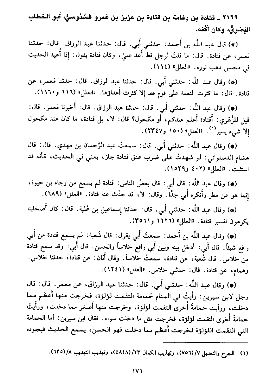 • وقال عبد الله: حدثني أبي. قال: حدثنا إسماعيل بن علية، قال: كان أصحابنا يكرهون تفسر قتادة. «العلل» (1126 و3561) .