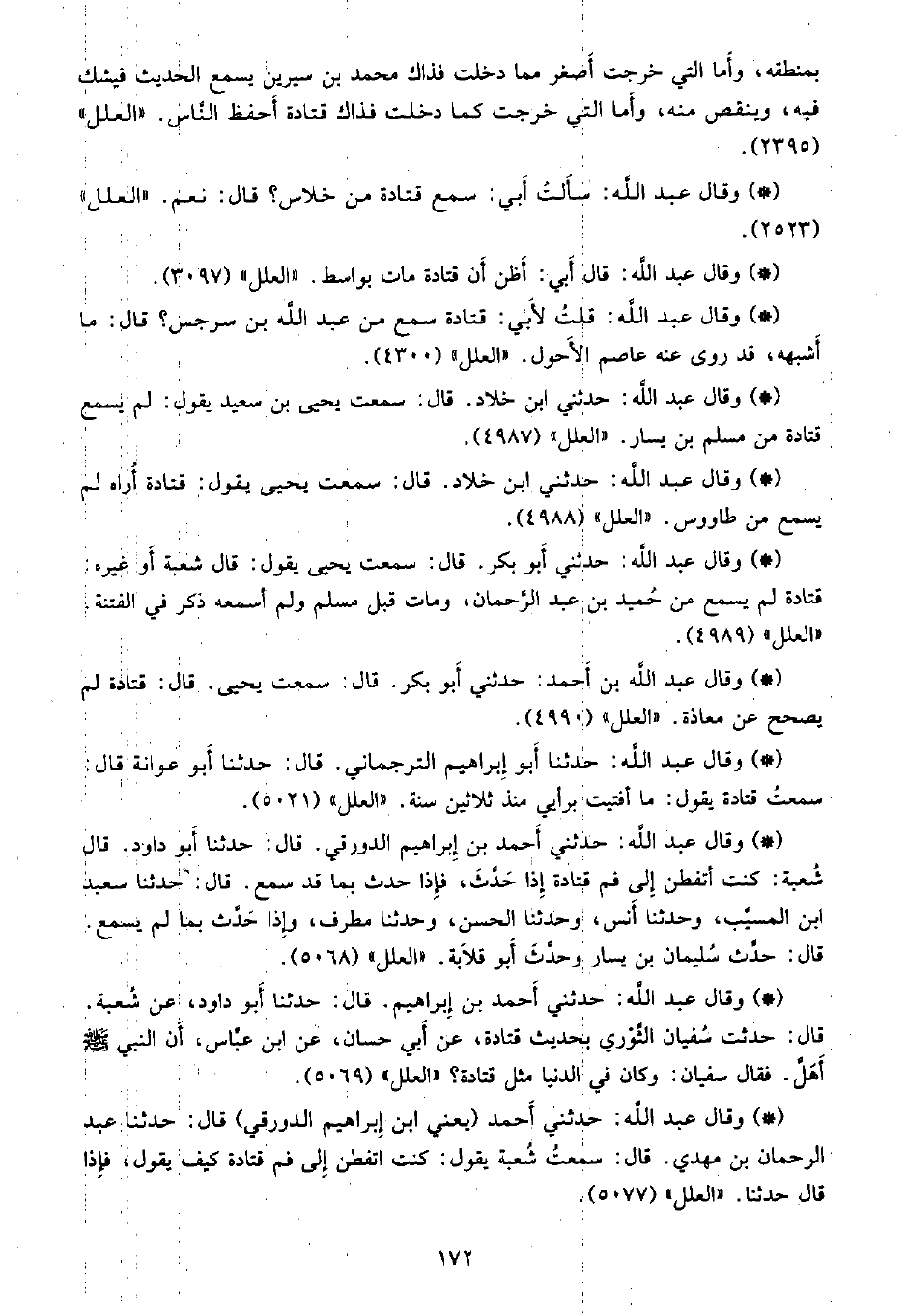 • وقال عبد الله: حدثني ابن خلاد، قال: سمعت يحيى بن سعيد يقول: لم يسمع قتادة من مسلم بن يسار. «العلل» (4987) .