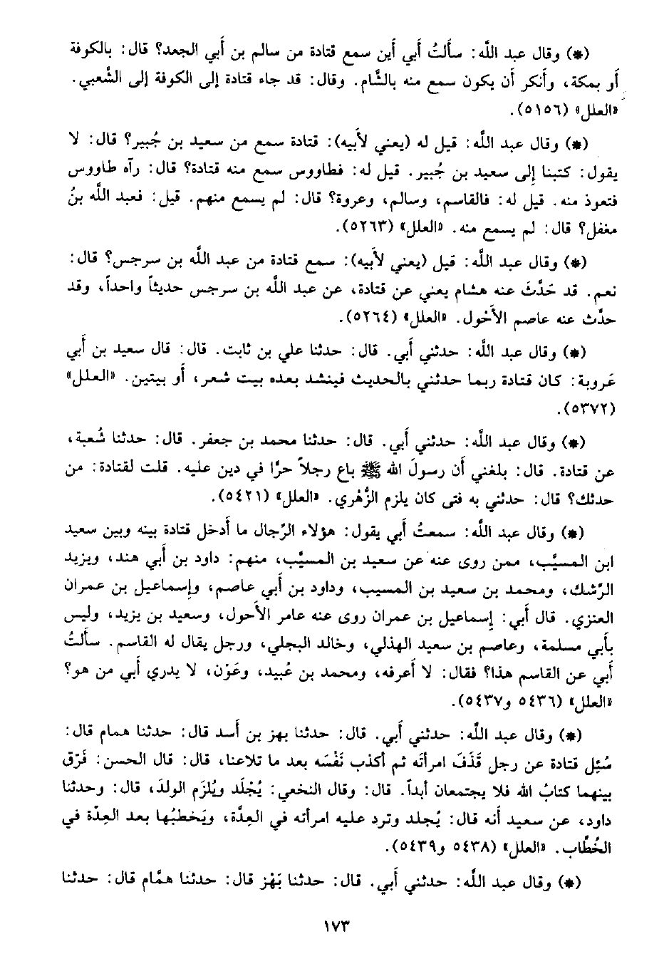• وقال عبد الله: سمعتُ أَبي يقول: هؤلاء الرجال ما أدخل قتادة بينه وبين سعيد بن المسيب، ممن روى عنه عن سعيد بن المسيب، منهم: داود بن أبي هند، ويزيد الرشك، ومحمد بن سعيد بن المسيب، وداود بن أبي عاصم، وإسماعيل بن عمران العزي، قال أبي: إسماعيل بن عمران روى عنه عامر الأحول، وسعيد بن يزيد، وليس بأبي مسلمة، وعاصم بن سعيد الهذلي، وخالد البجلي، ورجل يقال له القاسم، سألت أبي عن القاسم هذا؟ فقال: لا أعرفه، ومحمد بن عُبيد، وعون، لا يدري أبي من هو؟. «العلل» (5436 و5437) .