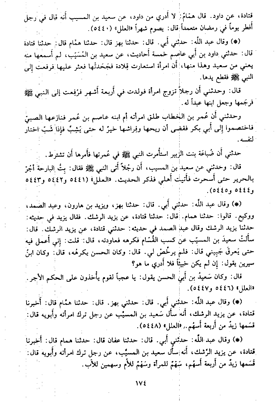 • وقال عبد الله: حدثني أبي. قال: حدثنا بهز، قال: حدثنا همام، قال: حدثنا قتادة، قال: حدثني داود بن أبي عاصم خمسة أحاديث، عن سعيد بن المسيب، لم أسمعها منه يعني من سعيد وهذا منها، أن امرأه استعارت قلادة فجحدتها فعثر عليها فرفعت إلى النبي - صلى الله عليه وسلم - فقطع يدها.