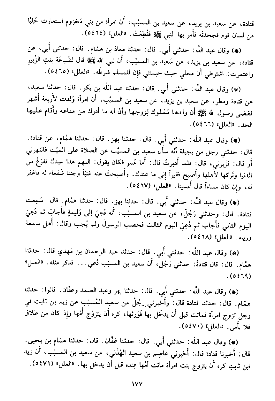 • وقال عبد الله: حدثني أبي. قال: حدثنا عبد الرحمن بن مهدي، قال: حدثنا همام، قال: قال قتادة: حدثني رجل، أن سعيد بن المسيب دعي ... فذكر مثله. «العلل» (5469) .
