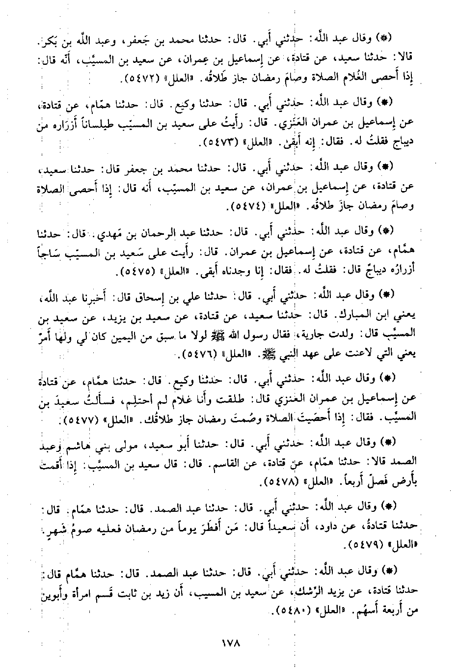 • وقال عبد الله: حدثني أبي. قال: حدثنا محمد بن جعفر، قال: حدثنا سعيد، عن قتادة، عن إسماعيل بن عمران، عن سعيد بن المسيب، أنه قال: إذا أحصى الصلاة وصام رمضان جاز طلاقه. «العلل» (5474) .