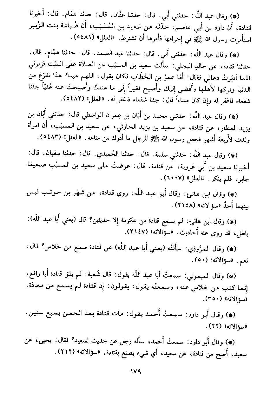 • وقال عبد الله: حدثني سلمة، قال: حدثنا الحميدي، قال: حدثنا سفيان، قال: أخبرنا سعيد بن أبي عروبة، عن قتادة، قال: عرضت على سعيد بن المسيب صحيفة جابر، فلم ينكر. «العلل» (6007) .