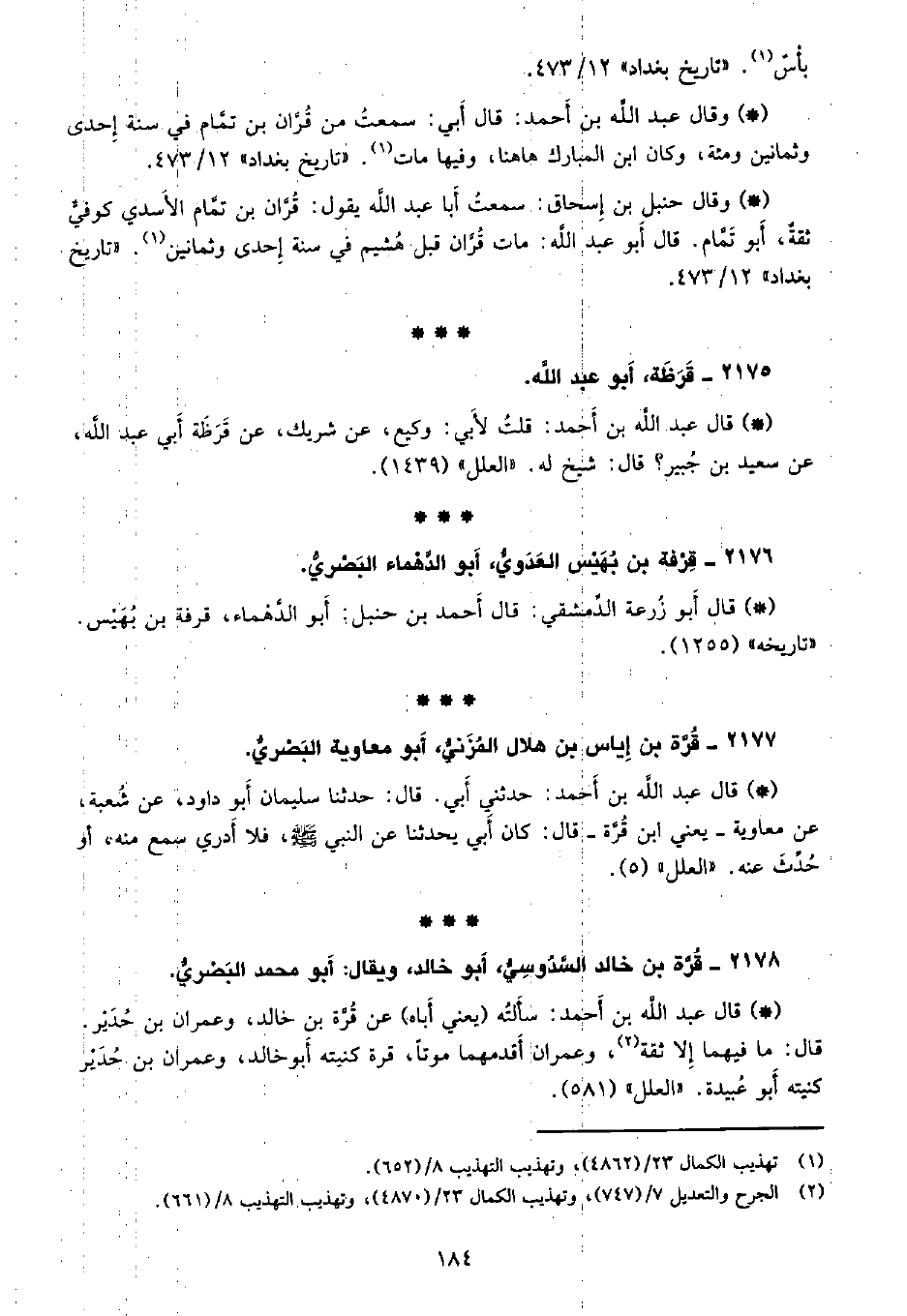• وقال عبد الله بن أحمد: قال أبي: سمعت من قران بن تمام في سنة إحدى وثمانين ومئة، وكان ابن المبارك هاهنا، وفيها مات. «تاريخ بغداد» 12/473.