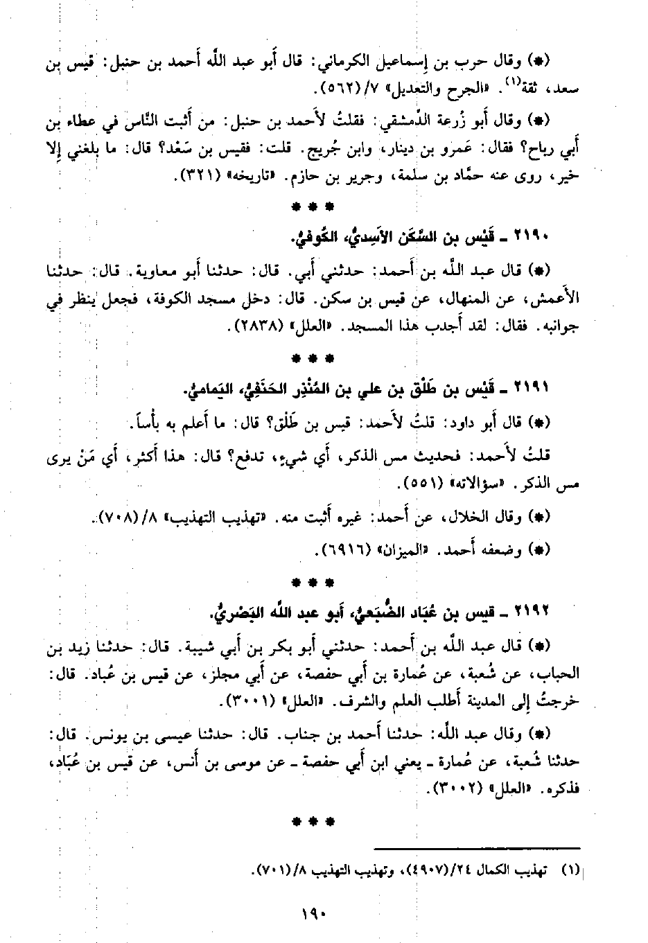 • قال عبد الله بن أحمد: حدثني أبي. قال: حدثنا أبو معاوية، قال: حدثنا الأعمش، عن المنهال، عن قيس بن سكن، قال: دخل مسجد الكوفة، فجعل ينظر في جوانبه، فقال: لقد أجدب هذا المسجد. «العلل» (2838) .