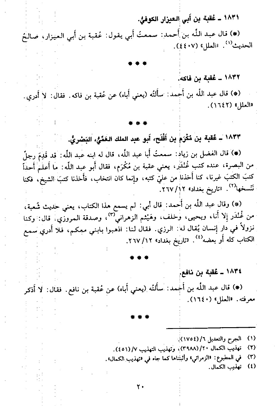 • قال الفضل بن زياد: سمعت أبا عبد الله، قال له ابنه عبد الله: قد قدم رجل من البصرة، عنده كتب غندر، يعني عقبة بن مكرم، فقال أبو عبد الله: ما اعلم أحدًا كتب الكتب غيرنا، كنا أخذنا من على كتبه، وإنما كان انتخاب، فاخذنا كتب الشيخ، فكنا ننسخها. «تاريخ بغداد» 12/267.
