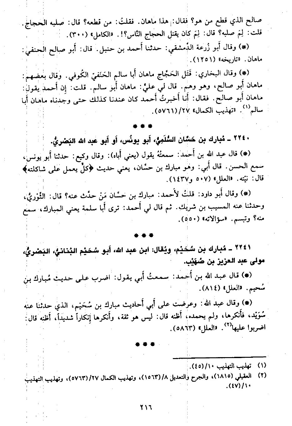 • وقال البخارى: قتل الحجاج ماهان أبا سالم الحنفي الكوفي، وقال بعضهم: ماهان أبو صالح، وهو وهم، قال لي علي: ماهان أبو سالم ن قلت إن أحمد يقو ل: ماهان أبو صالح، فقال: أنا أخبرت أحمد كان عندنا كذلك حتى وجدناه ماهان أبا سالم. «تهذيب الكمال» 27/ (5761) .