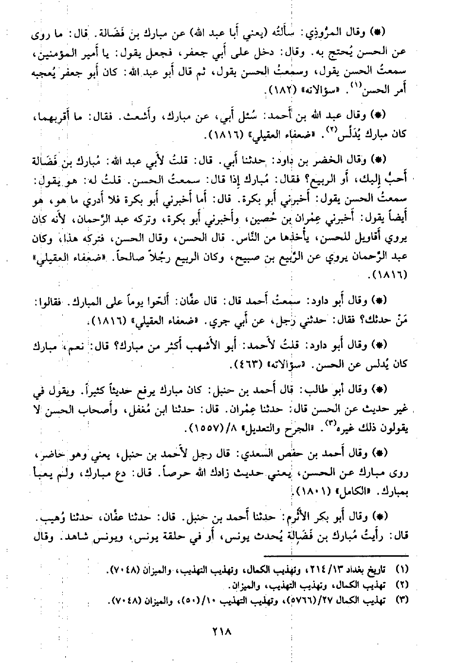• وقال أبو داود: قلت لأحمد: أبو الأشهب أكثر من مبارك؟ قال: نعم، مبارك كان يدلس عن الحسن. «سؤالاته» (463) .