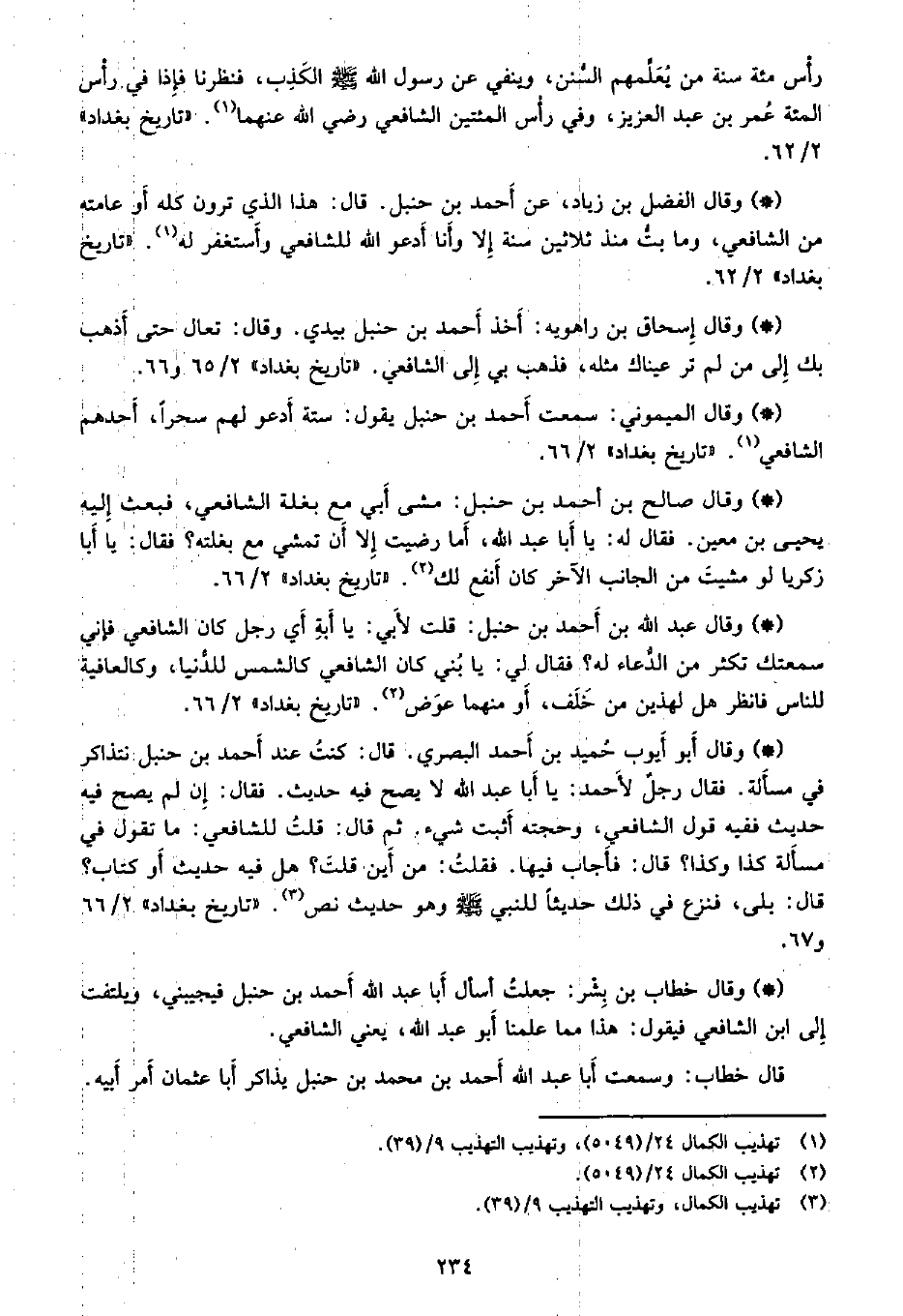 • وقال الفضل بن زياد، عن أحمد بن حنبل، قال: هذا الذي ترون كله أو عامته من الشافعي، وما بت منذ ثلاثين سنة إلا وأنا أدعو الله للشافعي وأستغفر له. «تاريخ بغداد» 2/62