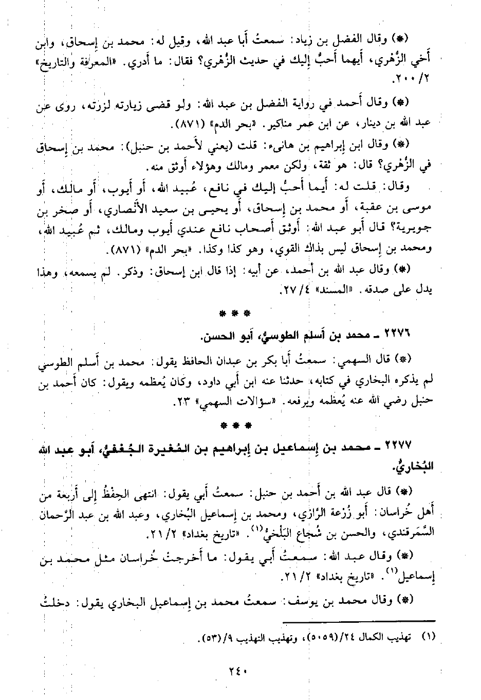 • قال السهمي: سمعت أبا بكر بن عبدان بن الحافظ يقول: محمد بن أسلم الطوسي لم يذكره البخاري في كتابه، حدثنا عنه ابن أبي داود، وكان يعضمه ويقول: كان أحمد بن حنبل رضي الله عنه يعظمه ويرفعه. «سؤلات السهمي» 23.