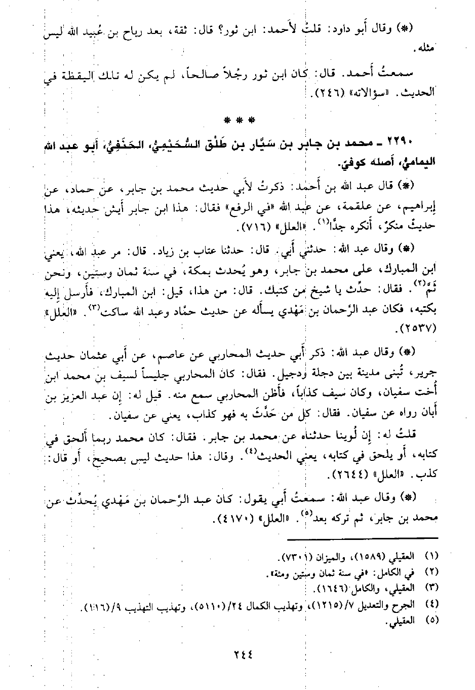• قال عبد الله بن أحمد: ذكرت لأبى حديث محمد بن جابر، عن حماد، عن إبراهيم، عن علقمة، عن عبد الله «في الرفع» فقال: هذا ابن جابر أيش حديثه، هذا حديث منكر، أنكره جدًا. «العلل» (716) .