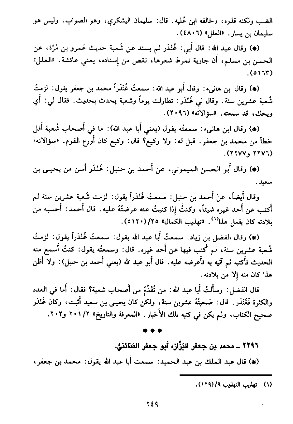قال الفضل: وسألت أبا عبد الله: من تقدم من أصحاب شعبة؟ فقال: أما في العدد والكثرة فغندر، قال: صحبته عشرين سنة، ولكن كان يحيى بن سعيد أثبت، وكان غندر صحيح الكتاب، ولم يكن في كتبه تلك الأخبار. «المعرفة والتاريخ» 2/201 و202.