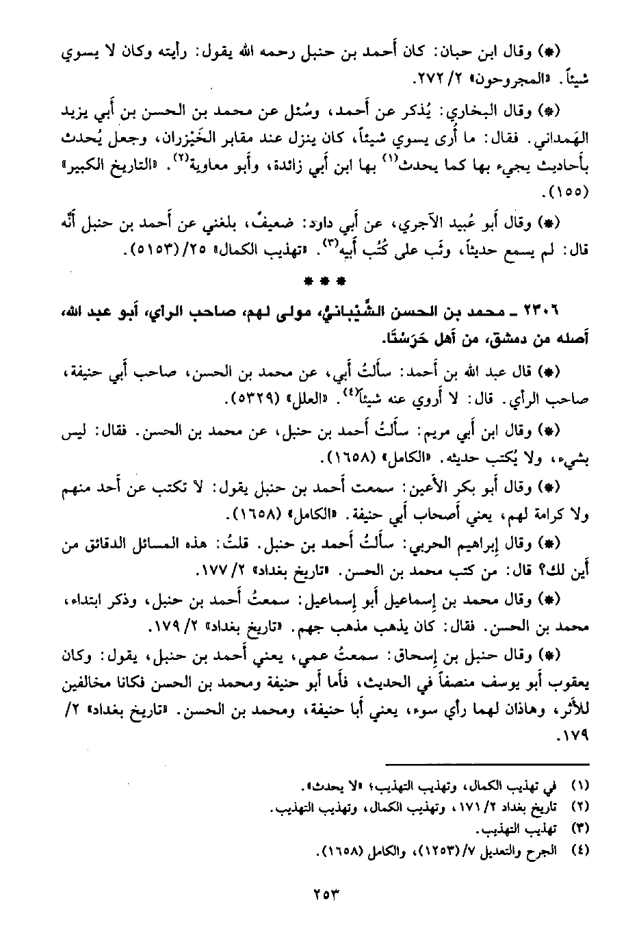 • وقال محمد بن إسماعيل أبو إسماعيل: سمعت أحمد بن حنبل، وذكر ابتداء، محمد بن الحسن، فقال: كان يذهب مذهب جهم. «تاريخ بغداد» 2/179.