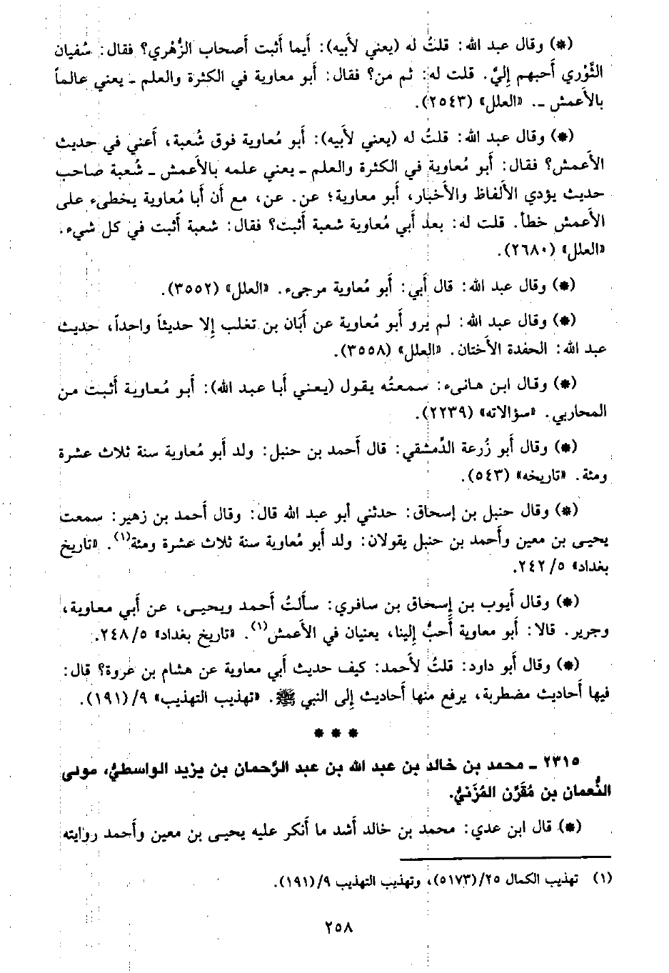 • وقال ابن هانىء: سَمِعتُهُ يقول (يعني أبا عبد الله) : أبو معاوية أثبت من المحاربي. «سؤالاته» (2239) .