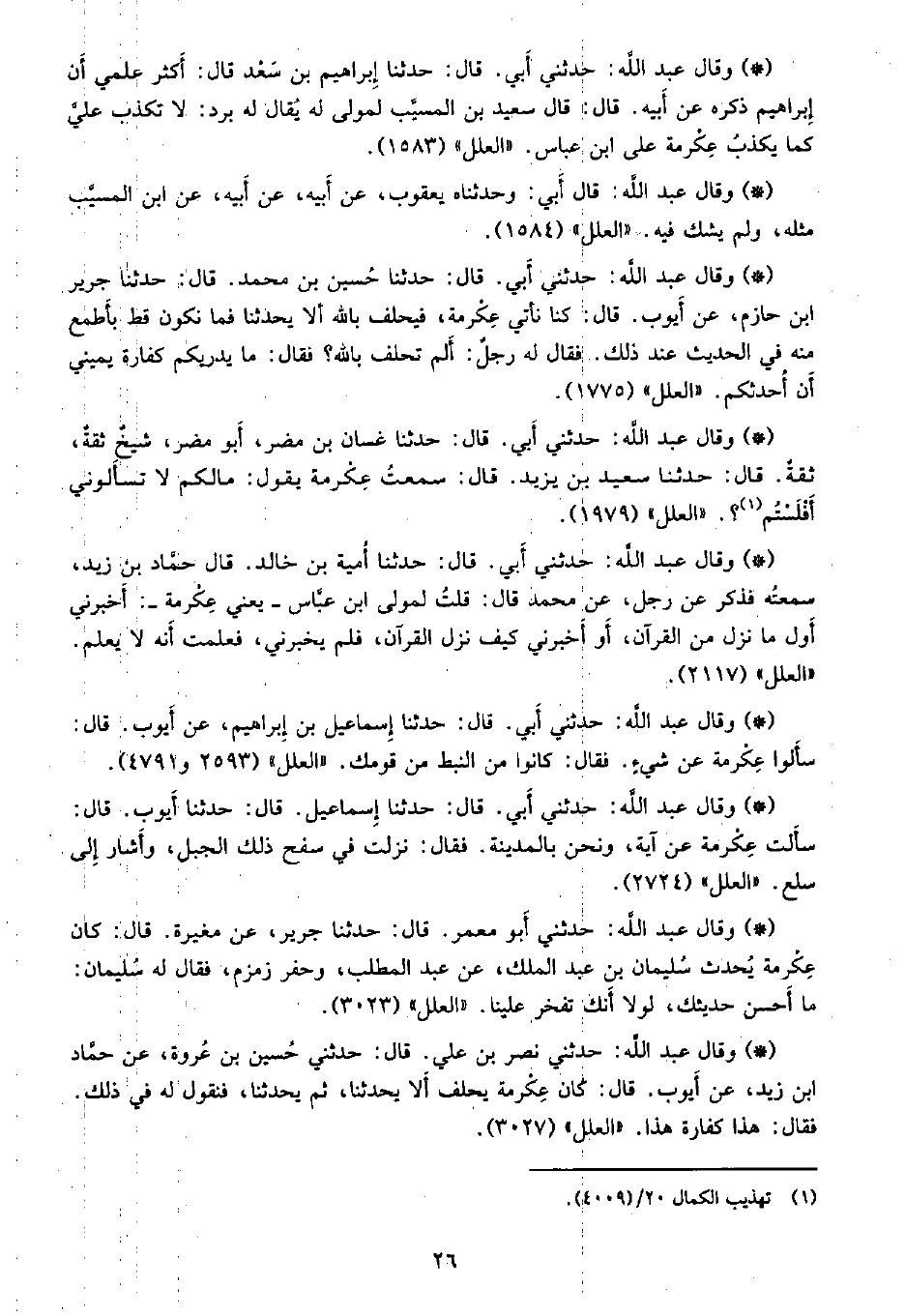 • وقال عبد الله: حدثني أبي. قال: حدثنا أمية بن خالد، قال حماد بن زيد، سَمِعتُهُ فذكر عن رجل، عن محمد قال: قلت لمولى ابن عباس -يعني عكرمة -: أخبرني أول ما نزل من القرآن، أو أخبرني كيف نزل القرآن، فلم يخبرني، فعلمت أنه لا يعلم. «العلل» (2117) .