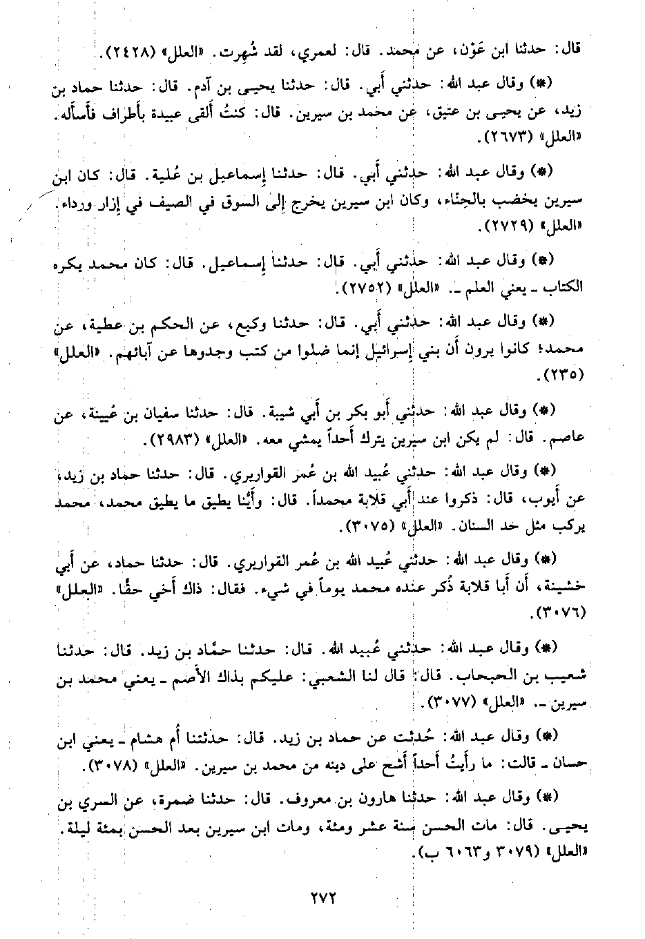 • وقال عبد الله: حدثت عن حماد بن زيد، قال: حدثتنا أم هشام -يعني ابن حسان - قالت: ما رأيت أحدًا أشح على دينه من محمد بن سيرين. «العلل» (3078) .