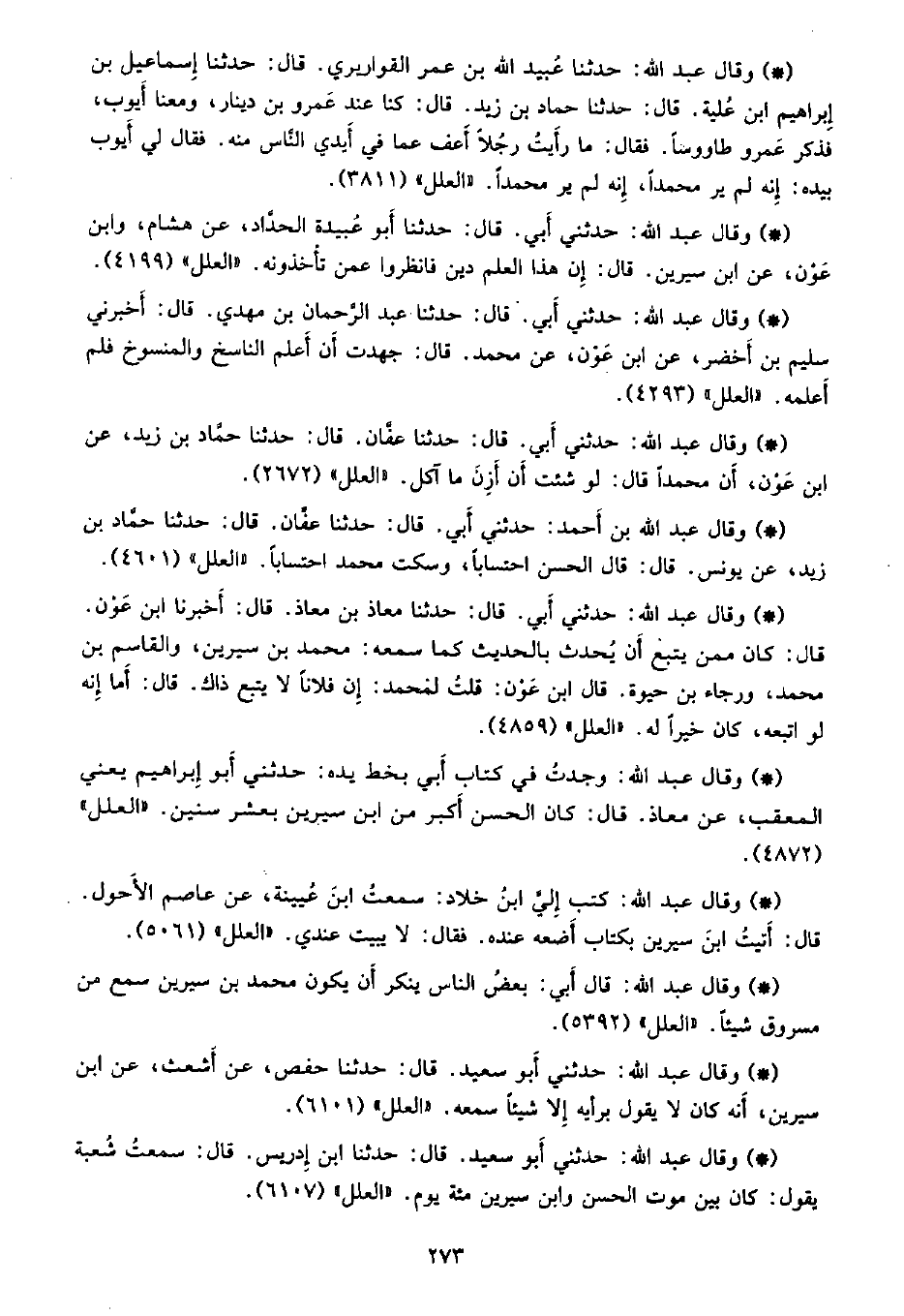 • وقال عبد الله: حدثني أبي. قال: حدثنا أبو عُبيده الحداد، عن هشام، وابن عون، عن ابن سيرين، قال: أن هذا العلم دين فانظروا عمن تأخذونه. «العلل» (4199) .
