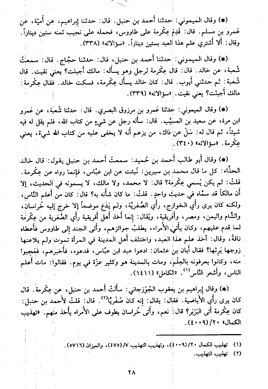 • وقال أبو طالب أحمد بن حميد: سمعت أحمد بن حنبل يقول: قال خالد الحذاء: كل ما قال محمد بن سيرين: نبئت عن ابن عباس، فإنما رواه عن عكرمة، قلت: لم يكن يسمي عكرمة؟ قال: لا محمد، ولا مالك، لا يسمونه في الحديث، إلا أن مالكًا قد سماه فى حديث واحد، قلت: ما كان شأنه به؟ قال: كان من أعلم الناس، ولكنه كان يرى رأي الخوارج، رأي الصفرية، ولم يدع موضعًا إلا خرج إليه خراسان، والشام، واليمن، ومصر، وأفريقية، ويقال: إنما أخذ أهل أفريقية رأي الصفرية من عكرمة لما قدم عليهم، وكان يأتي الأمراء، يطلب جوائزهم، وأتى الجند إلى طاووس فأعطاه ناقة، وقال: أخذ علم هذا العبد، واختلف أهل المدينة في المرأة تموت ولم يلاعنها زوجها يرثها؟ فقال أبان بن عثمان: ادعوا عبد ابن عباس، فدعوه، فأخبرهم، فعجبوا منه، وكانوا يعرفونه بالعلم، ومات بالمدينة هو وكثير عزة في يوم، فقالوا: مات أعلم الناس، وأشعر الناس. «الكامل» (1411) .
