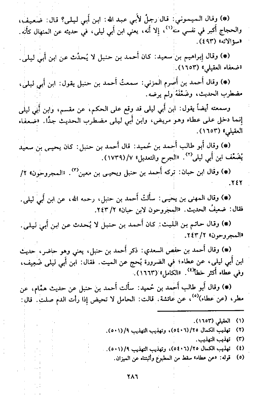 • وقال إبراهيم بن سعيد كان أحمد بن حنبل لا يحدث عن ابن أبي ليلى، «ضعفاء العقيلي» (1653) .