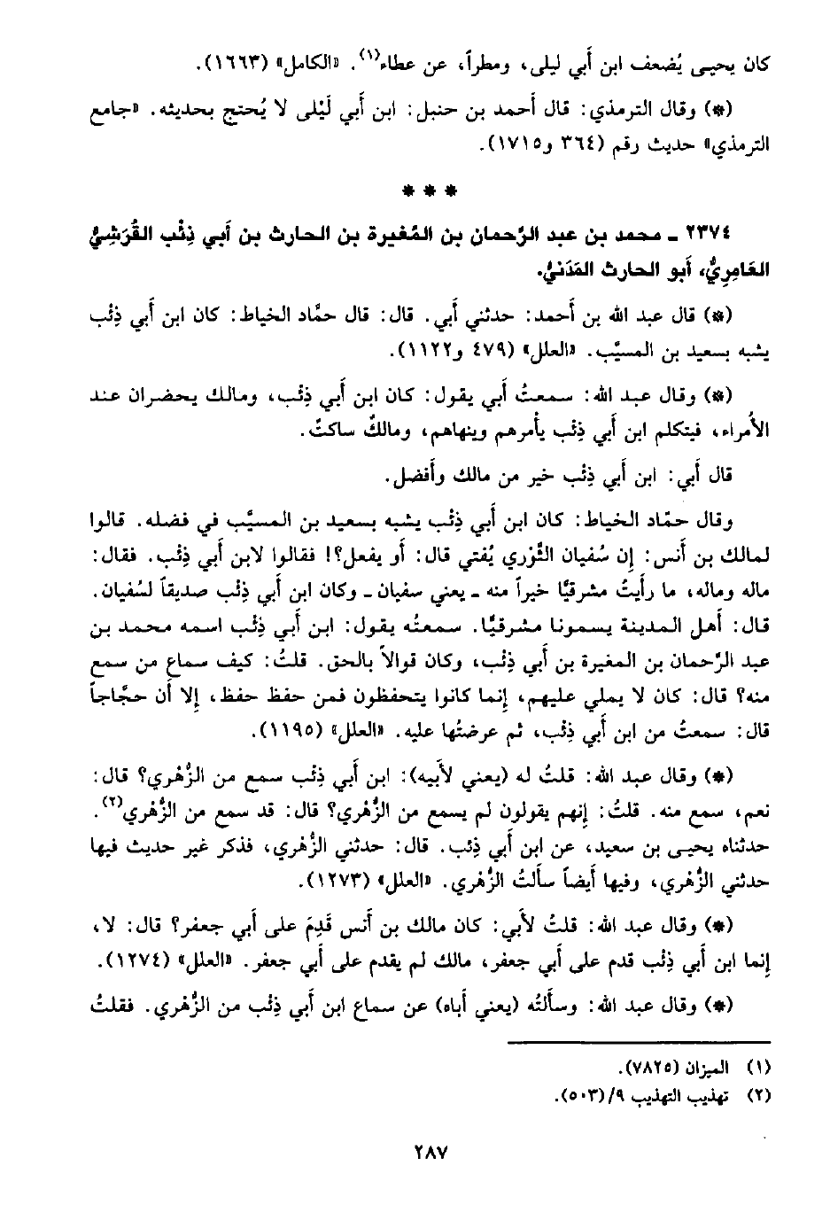 2374 - محمد بن عبد الرحمن بن المغيرة بن الحارث بن أبي ذئب القرشي العامري، أبو الحارث المدني.