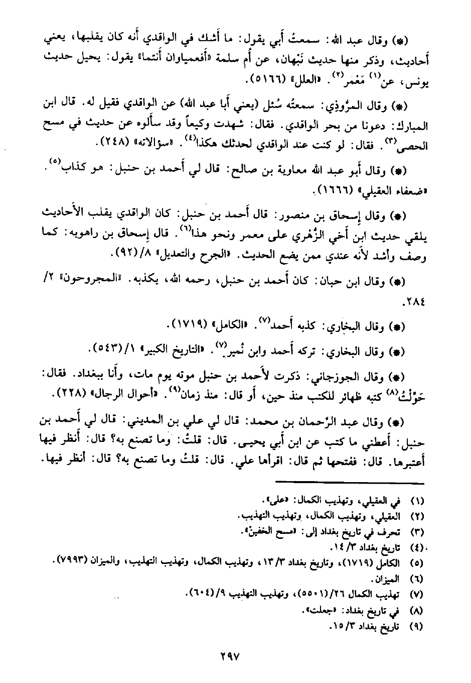 • وقال إسحاق بن منصور: قال أحمد بن حنبل: كان الواقدي يقلب الأحاديث يلقي حديث ابن أخي الزهري على معمر ونحو هذا، قال إسحاق بن راهوية: كما وصف وأشد لأنه عندي ممن يضع الحديث. «الجرح والتعديل» 8/ (92) .