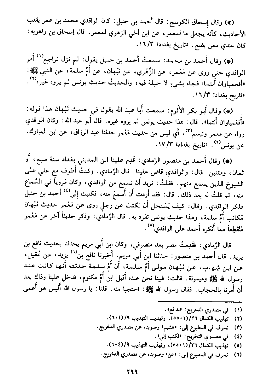• وقال أحمد بن محمد: سمعت أحمد بن حنبل يقول: لم نزل نراجع امر الواقدي حتى روى عن معمر، عن الزهري، عن نبهان، عن أم سلمة، عن النبي - صلى الله عليه وسلم -: «أفعمياوان أنتما» فجاء بشيء لا حيلة فيه، والحديث حديث يونس لم يروه غيره. «تاريخ بغداد» 3/16.