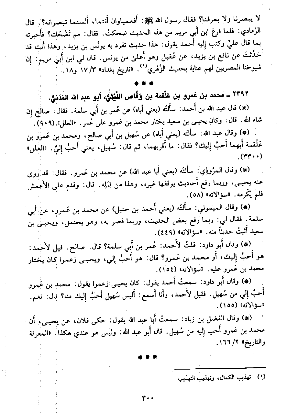 • وقال الفضل بن زياد: سمعت أبا عبد الله يقول: حكى فلان، عن يحيى، أن محمد بن عمرو أحب إليه من سهيل، قال أبو عبد الله: وليس هو عندي هكذا. «المعرفة والتاريخ» 2/166.