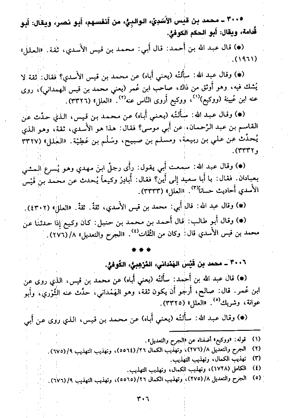 • وقال عبد الله: سألته (يعني أَباه) عن محمد بن قيس الأسدي؟ فقال: ثقة لا يشك فيه، وهو أوثق من ذاك، صاحب ابن عمر (يعني محمد بن قيس الهمداني) ، روى عنه ابن عيينة (ووكيع) ، ووكيع أروى الناس عنه. «العلل» (3326) .