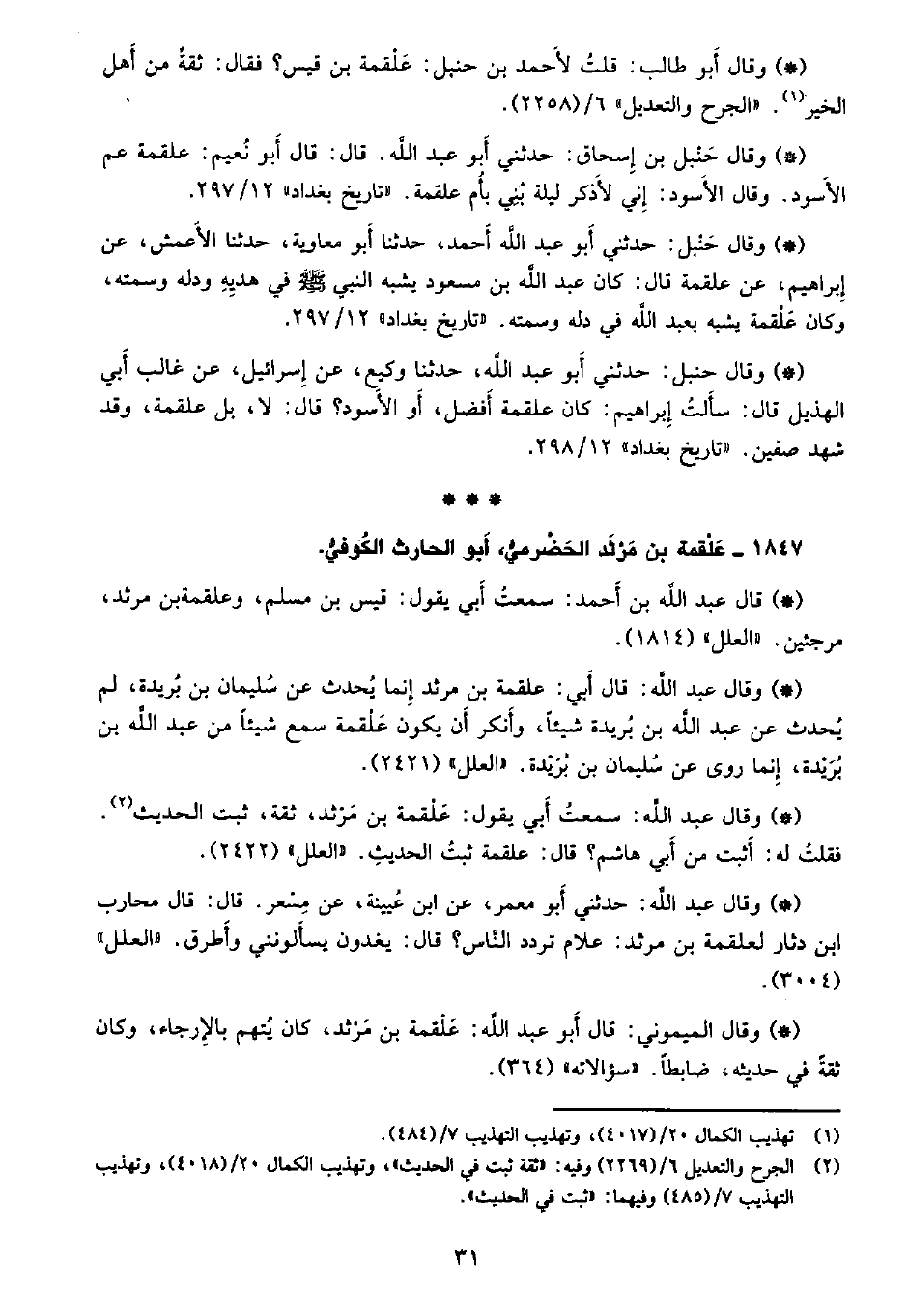 • وقال الميموني: قال أبو عبد الله: علقمة بن مرثد، كان يتهم بالارجاء، وكان ثقة في حديثه، ضابطًا. «سؤالاته» (364) .