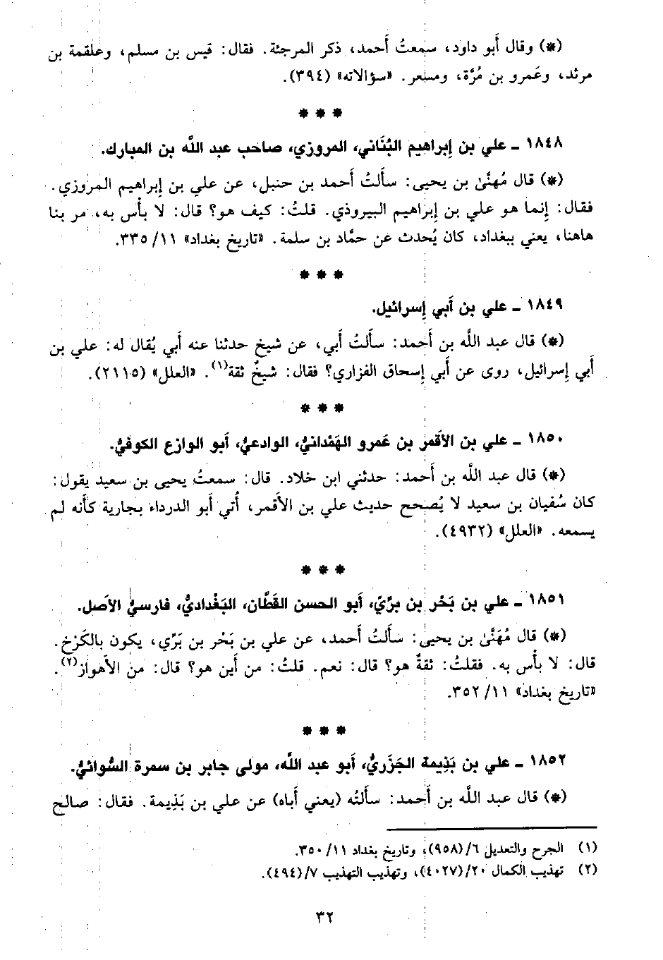 • قال مهنى بن يحيى: سألت أحمد، عن علي بن بحر بن بري، يكون بالكرخ، قال: لا بأس به، فقلت: ثقة هو؟ قال: نعم، قلت: من أين هو؟ قال: من الأهواز. «تاريخ بغداد» 11/352.