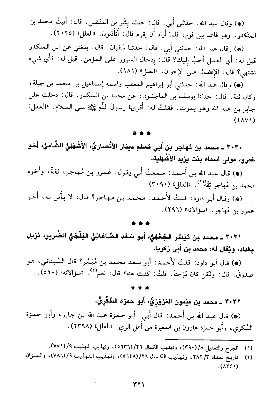 • وقال أبو داود: قلت لأحمد: محمد بن مهاجر؟ قال: لا بأس به، أخو عمرو بن مهاجر. «سؤالاته» (296) .