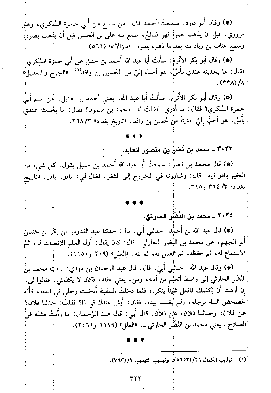 • وقال عبد الله: حدثني أبي. قال: قال عبد الرحمن بن مهدي: تبعت محمد بن النضر الحارثي إلى واسط أتعلم من أدبه، ومن، يعني عقله، فكان لا يكلمني، فقالوا لي: إن أردت أن يكلمك فافعل شيئًا ينكره، فلما دخلت السفينة أدخلت رجلي في الماء، كأنه خضخض الماء برجله، ولم يغسله بيده، فقال: أيش عندك في ذا؟ فقلت: حدثنا فلان، عن فلان، وحدثنا فلان، عن فلان، قال أبي: قال عبد الرحمن: ما رأيت مثله في الصلاح -يعني محمد بن النضر الحارثي -. «العلل» (1119 و2461) .