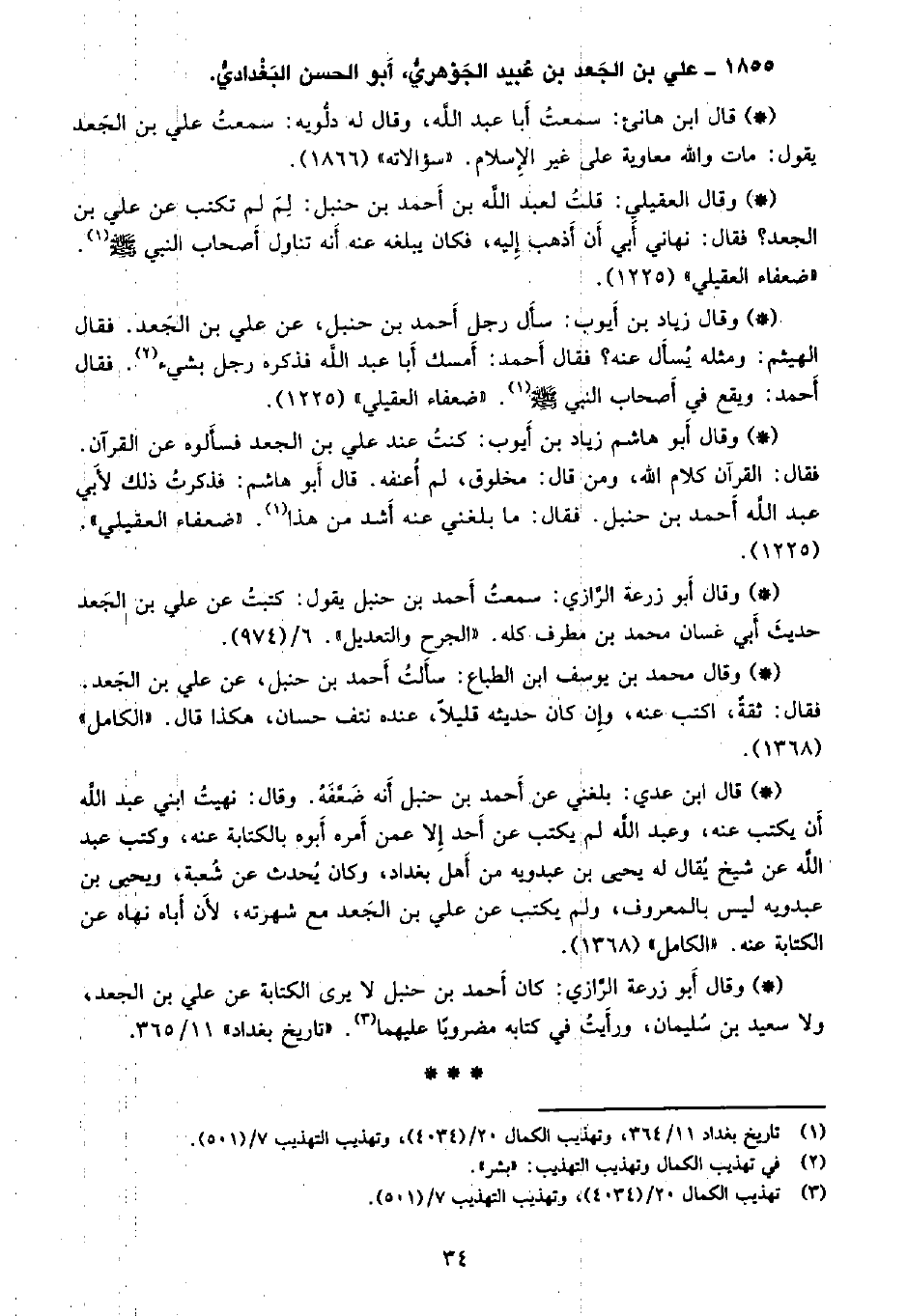 • وقال زياد بن أيوب سأل رجل أحمد بن حنبل، عن علي بن الجعد، فقال الهيثم: ومثله يسأل عنه؟ فقال أحمد: أسمك أبا عبد الله فذكره رجل بشيء، فقال أحمد: ويقع في أصحاب النبي - صلى الله عليه وسلم -. «ضعفاء العقيلي» (1225) .