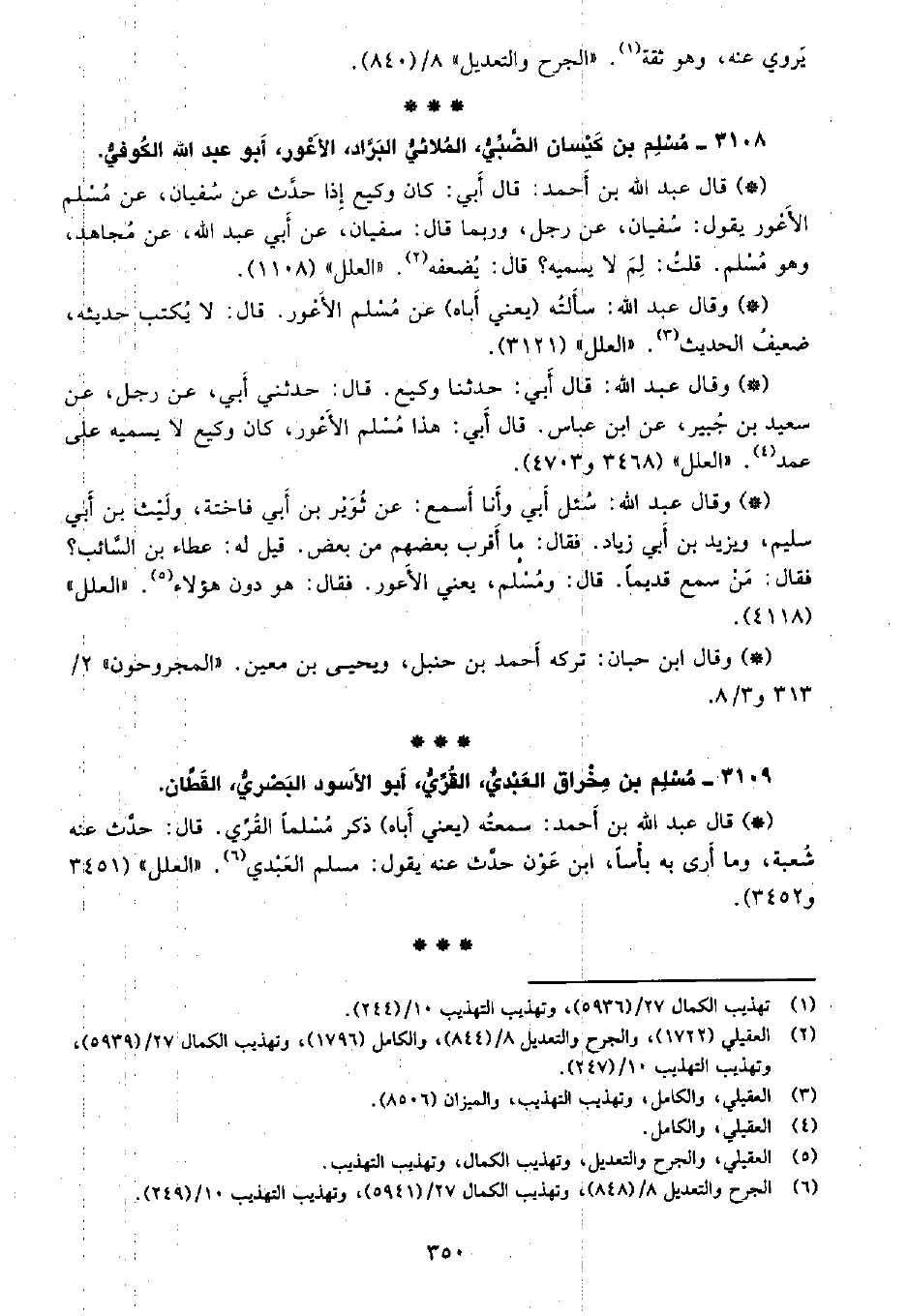 • وقال عبد الله: سألته (يعني أَباه) عن مسلم الأعور، قال: لا يكتب حديثه، ضعيف الحديث. «العلل» (3121) .