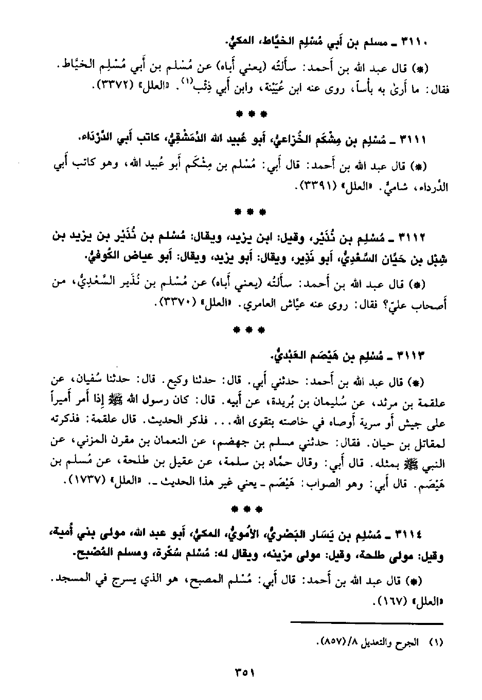 • قال عبد الله بن أحمد: قال أبي: مسلم المصبح، هو الذي يسرج في المسجد. «العلل» (167) .
