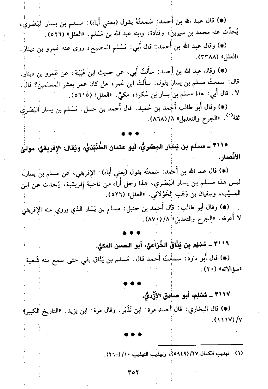 • وقال أبو طالب أحمد بن حميد: قال أحمد بن حنبل: مسلم بن يسار البصري ثقة. «الجرح والتعديل» 8/ (868) .