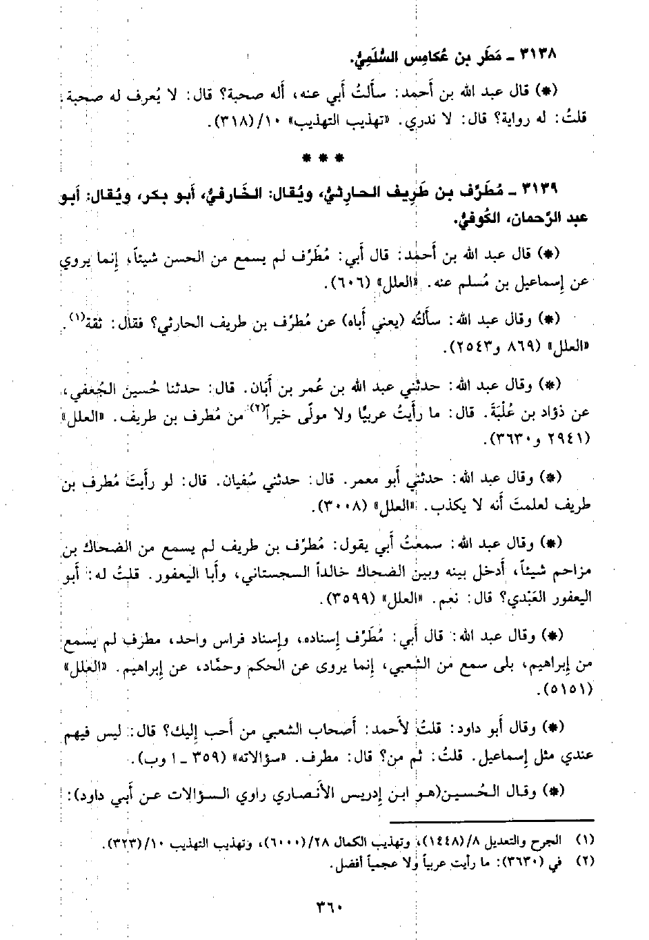 • وقال عبد الله: سألته (يعني أَباه) عن مطرف بن طريف الحارثي؟ فقال: ثقة. «العلل» (869 و2543) .