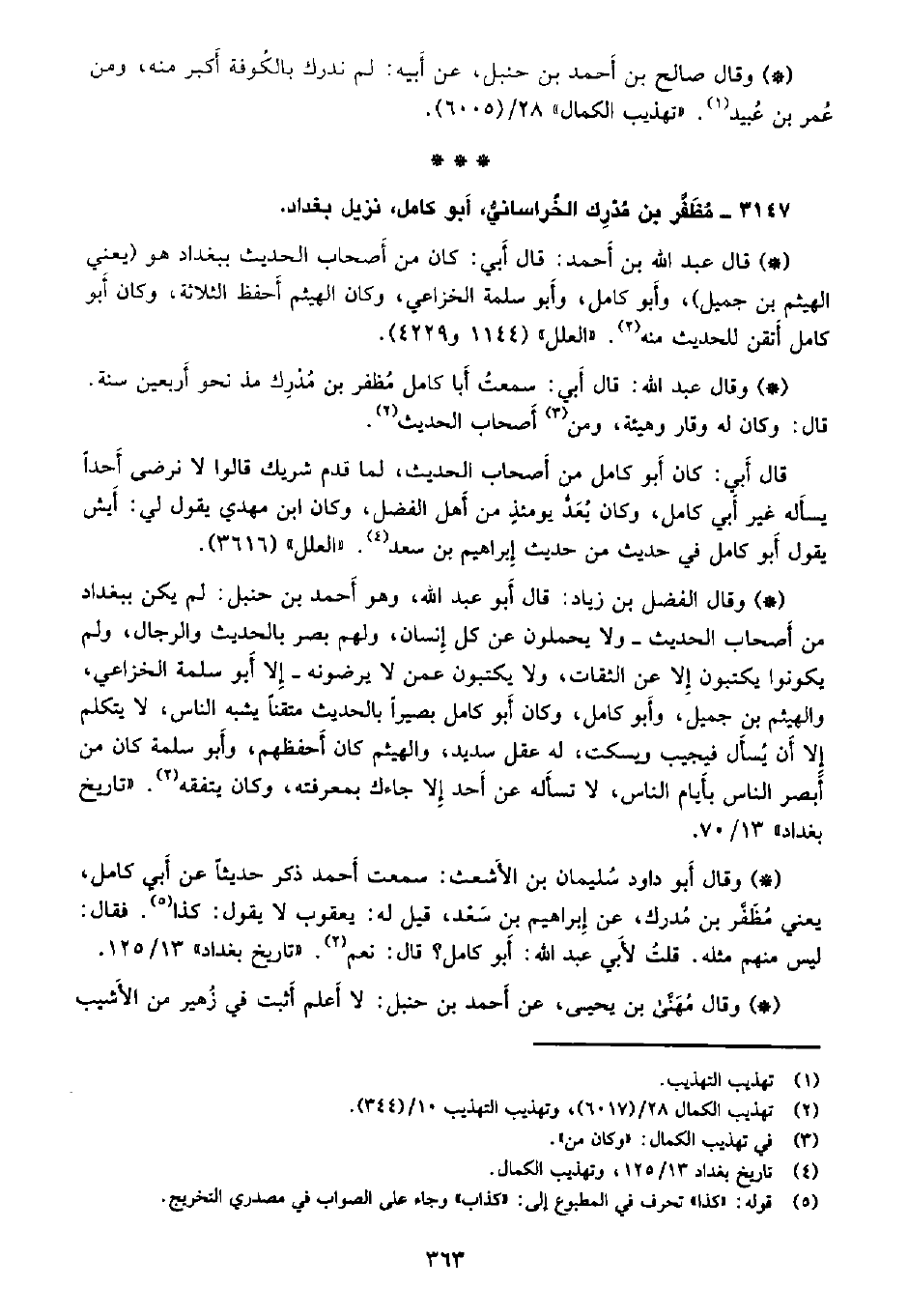 • وقال أبو داود سليمان بن الأشعث: سمعت أحمد ذكر حديثًا عن أبي كامل، يعني مظفر بن مدرك، عن إبراهيم بن سعد، قيل له: يعقوب لا يقول: كذا، فقال: ليس منهم مثله، قلت لأبي عبد الله: أبو كامل؟ قال: نعم. «تاريخ بغداد» 13/125.